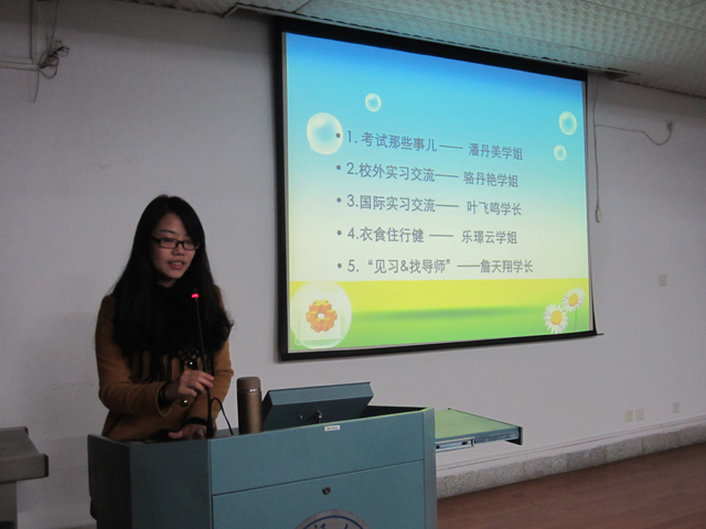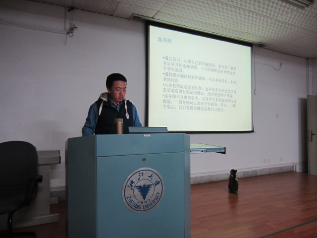 2014年3月4日,由医学院10级本科生第一党支部与08级第二党支部共同主办的华家池学习和生活攻略开交流会在教604隆重召开。会上,08级潘丹美学姐、骆丹艳学姐、叶飞鸣学姐、乐璟云学姐和詹天翔学长分别分享和介绍了华家池学习和生活的小技巧。交流会由08级第二党支部李娜学姐和10级第一支部组织委员严润兰主持。