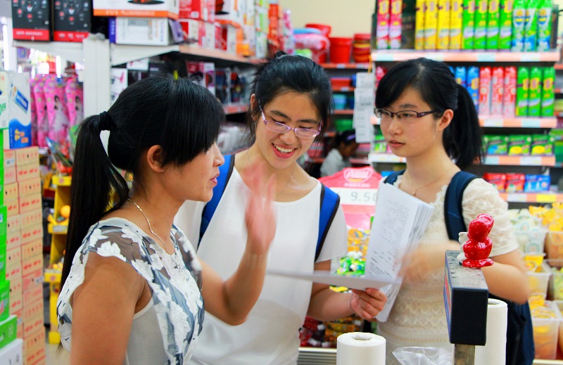 第二天,大二的同学便开始一天在烈日下的调研了。以镇政府为中心,每两人为一组,向两边的街道扫街调查。大家主要通过两种方式调查:口头询问与直接填写。对于填写有困难的人员,队员一题题地把问卷读给他们听,再根据他们的回答如实填写;对于有文化、有意愿的被调查人员,则将问卷留给他们填写,一定时间后回收。早上的调研在大家的努力下异常顺利,一个上午便收集了大约三四十份问卷。