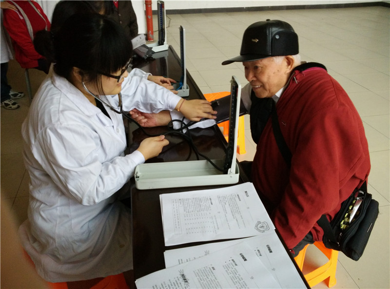 我们的服务内容包括量血压、肩部按摩以及高血压和感冒的健康知识宣传。到达社区后,我们在社区大厅放置了3台血压计,安排了若干肩部按摩的座位。不久就有大爷大妈前来量血压。在仔细地测量完血压后,若老人患有高血压病,我们会跟他们交代一些高血压的健康生活方式,包括戒烟限酒、适当运动、适当降低体重、避免劳累过度及保持心情舒畅等。除此之外,我们还与老人们攀谈了起来,详细地了解了他们的健康状况,尽我们之可能,为他们解答健康方面的疑惑。听完了我们的建议,大叔大妈们都笑着与我们道谢。凑巧的是,有一位大爷说他前段时间刚刚从浙一医院肾内科出院,而我们之中正好有一位同学前段时间从该科室见习过,他一下就认出了这位大爷曾经是他组中的病人,并仔细地询问了他这段时间的病情。这不能说不是缘分使然。临走时,大爷还不忘让同学代他向当时的主管医生问好。